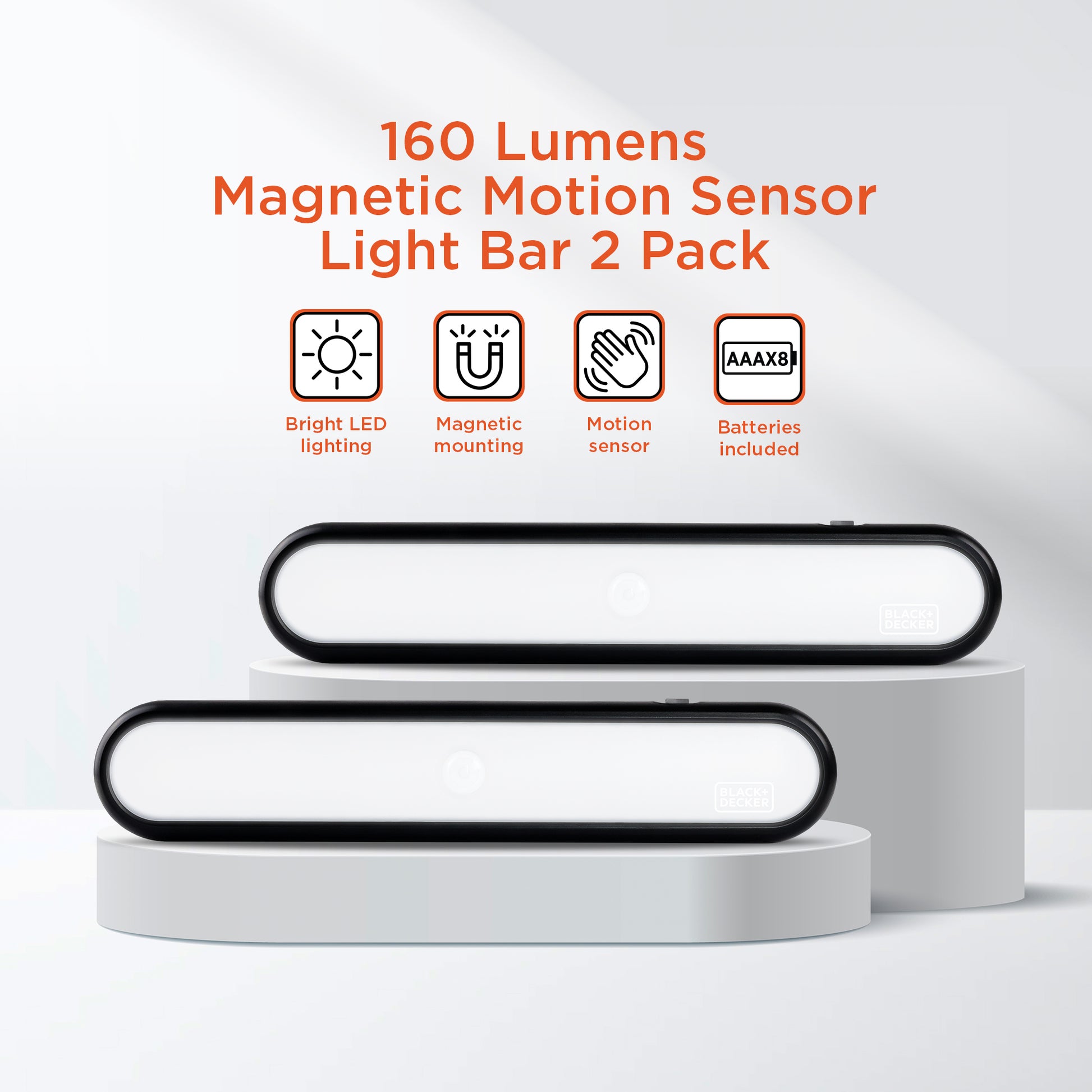 Brighten your home or workspace with the BLACK+DECKER 160 Lumens Battery-Powered Lights, a sleek and space-saving lighting solution for dark indoor areas. Each .75” x 1.6” x 8.3” light bar features a built-in motion sensor light for hands-free operation. The lights will automatically turn on when movement is detected and off when it’s not. The ultra-slim design fits easily into tight areas such as closets, storage nooks, and crawl spaces, brightening your home without causing clutter. Each light bar includes an adhesive-backed magnetic mounting plate that attaches to most surfaces, allowing you to snap the battery-operated wall lights on and off with ease. Quickly remove them when you want to hold them, bring them on the go, or if you need to change the batteries. Powered by 4x AAA batteries each (included with purchase), these LED cabinet lights are perfect for spaces without electrical outlets or for use during power outages. Whether you're organizing closet lighting, lighting a workbench, or adding visibility to a hallway, these motion sensor lights offer a simple, effective solution to make life easier. Ideal for any room or hidden space, these battery-powered lights blend function with convenience. Let these compact, motion-activated bars upgrade your everyday lighting needs effortlessly.