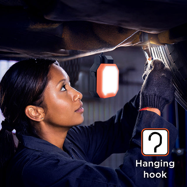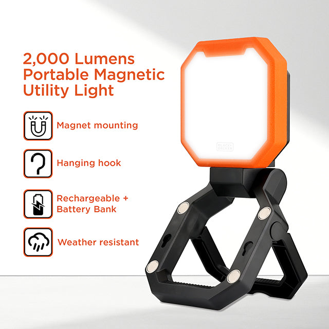 Light up any job or trip with the BLACK+DECKER 2,000LM LED Work Light, built for power and portability. This rechargeable work light has three brightness levels, 30%, 50%, and 100%, plus an emergency flash mode for added safety. Use the high mode for full brightness or switch to low to save battery during long use. It’s an ideal portable light for power outages, repairs, or outdoor adventures. Stay powered and ready with the built-in 4,000mAh battery, giving you up to 9.5 hours of light depending on brightness level. This rechargeable light charges fast with the included USB-C cable and doubles as a power bank with a USB-A port to charge your phone or other devices. Compact and lightweight, this portable work light fits easily in toolboxes, backpacks, or emergency kits, so you can take it anywhere. Easily set it up using the folding stand, rotating hook, strong magnetic base, or keyhole hangers. Whether you're working under the car, inside a tent, or on a dark wall, this LED work light mounts securely and stays in place. Its IP65 rating makes this work light resistant to dust and rain, giving you reliable performance in tough conditions. Be prepared with BLACK+DECKER 2,000LM LED Work Light!